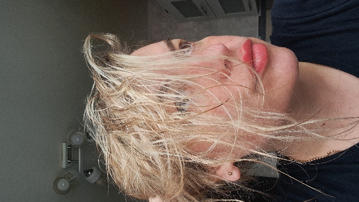 The image displays a close-up, angled portrait of an individual, likely female, captured indoors in Yegoryevsk, Russia. The subject's light blonde hair appears wet and disheveled, with strands falling across the face, partially obscuring the left eye. The visible right side of the face reveals light brown or hazel eyes, a natural skin tone, and full lips accentuated with a reddish-pink color, slightly puckered. A small, spherical, gold-colored stud is visible in the right earlobe. A dark-colored garment, possibly a t-shirt, is visible on the subject's shoulder and neck, along with a thin gold-colored chain necklace. A hand, potentially the subject's right, is partially visible in the upper left, appearing to interact with the hair. The background features a light-colored ceiling with a modern light fixture containing multiple globe-shaped bulbs mounted centrally. To the upper right, light-colored modular cabinets, consistent with a kitchen or bathroom setting, are visible against a textured light grey wall. The individual's gaze is directed upwards and to the right, away from the camera.
