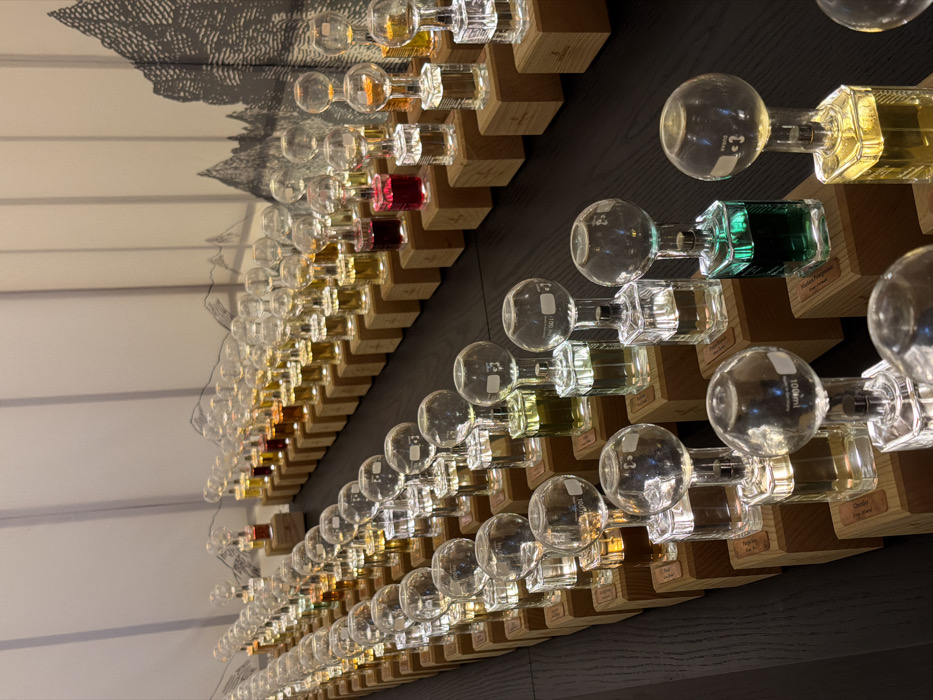 A display of numerous perfume bottles arranged in rows on wooden blocks. Each bottle has a round bulb-shaped top and a square base, holding various colored liquids. The display is mounted on a dark wooden surface, and a mountain range silhouette is faintly visible in the background. The lighting creates a bright, reflective effect on the glass bottles.