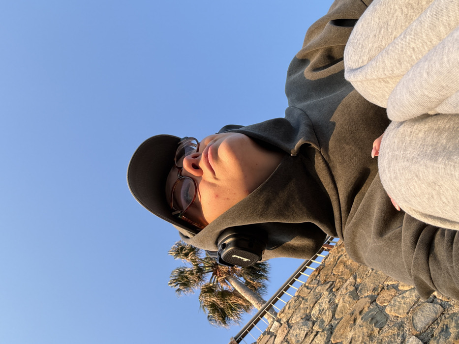 A low-angle photograph captured outdoors in Sanremo, Italy, depicts an individual from the chest up, positioned against a clear blue sky. The subject wears a dark grey hooded sweatshirt with the hood up, a dark grey baseball cap, and tortoise-shell framed eyeglasses. Black Marshall on-ear headphones are visible over their ears. Their face, illuminated by direct, warm sunlight from the upper right, is angled upwards and slightly to the right. The hands, displaying pink-painted fingernails, are clasped or resting on light grey sweatpants visible on the lap. In the upper left background, a palm tree with green fronds is partially visible. Below and to the left of the subject, a stone wall constructed from irregular, light-colored rocks is present, topped by a light-colored metal railing.