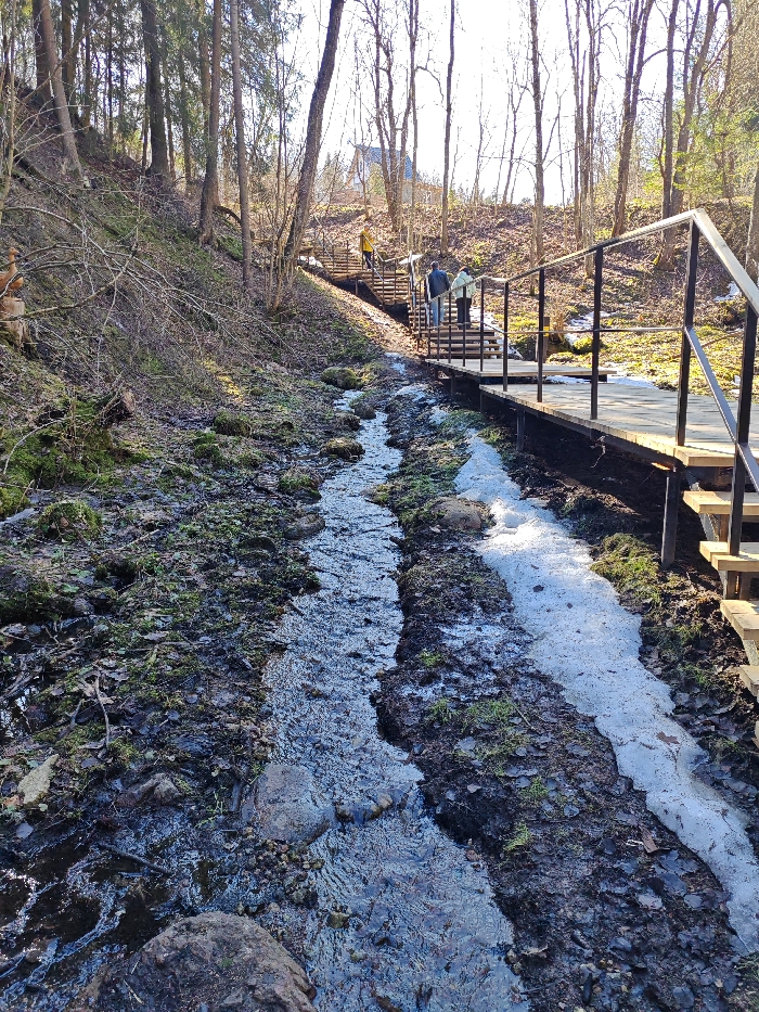 The image captures a scene within a wooded area in Lopukhinka, Russia, characterized by transitional seasonal conditions. A narrow, rocky stream, approximately 1-2 meters wide, flows from the distant background towards the immediate foreground, occupying the central and left portions of the frame. Its banks consist of dark, damp soil, moss, and scattered dead leaves. Adjacent to the stream on its right, residual patches of white snow are present, indicating a recent or ongoing thaw. To the right of the stream, a newly constructed wooden boardwalk with dark metal handrails extends from the foreground and transitions into an ascending series of wooden stairs. Three individuals are visible on these stairs, all moving uphill. The individual closest to the foreground is dressed in dark clothing. Behind them, a second person wears a light green or grey jacket over dark pants. Further up the stairs, a third person is identifiable by a bright yellow jacket. The left side of the image features a steep, wooded hillside covered with bare deciduous trees, some mossy ground, and fallen branches. A carved wooden object, resembling a large bird or duck sculpture, is partially visible at the base of this hillside on the far left. In the distant background, at the crest of the hill and visible through the bare tree branches, stands a light-colored building with a dark roof. The scene is illuminated by bright, clear sunlight, casting shadows and indicating an exposed outdoor environment.