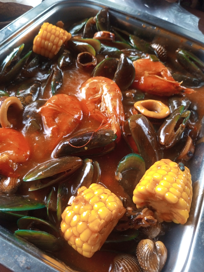 A metal tray overflows with seafood in a reddish-brown sauce. Shrimp, mussels with green shells, squid rings, clams, and chunks of corn on the cob are visible. A fly lands on one piece of corn. The sauce is thick and coats all the ingredients, giving them a glossy appearance. The dish appears freshly prepared and is ready to be served.