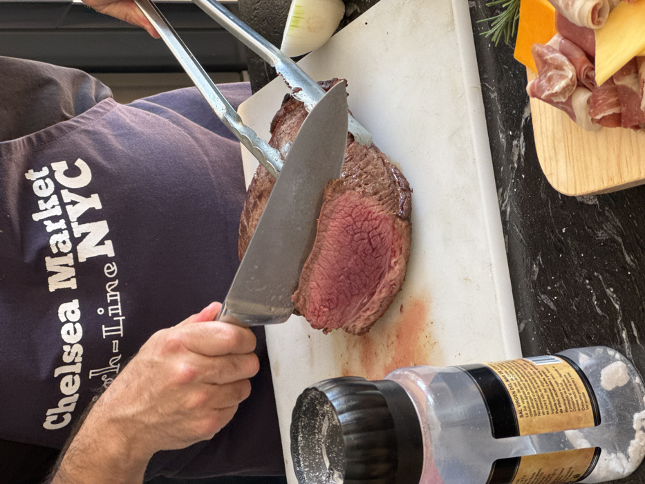 - "A person wearing a "Chelsea Market NYC" apron slices a medium-rare roast beef on a white cutting board with a large knife, held by the right hand" by FM-kPzhn1, licensed under CC BY 4.0