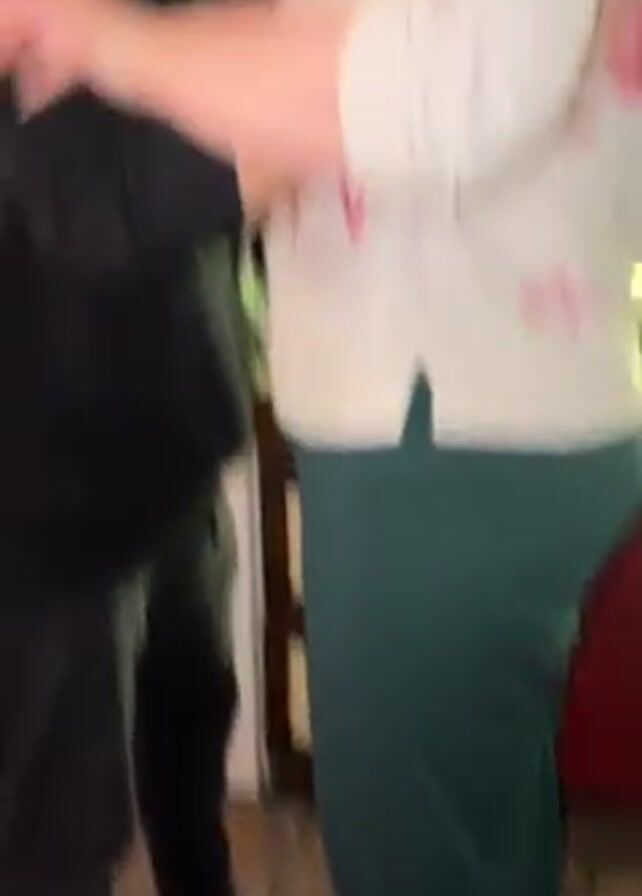 The video depicts a dimly lit kitchen setting with several individuals present. The camera focuses on a bald man in a black hoodie who is holding a woman, who is wearing a white shirt with pink hearts and a large, fuzzy white hat. The woman’s face is largely obscured by the hat. Other individuals can be seen in the periphery, sitting or standing. The kitchen features patterned tile flooring, a white refrigerator, and wooden cabinets. The overall atmosphere seems casual and intimate.