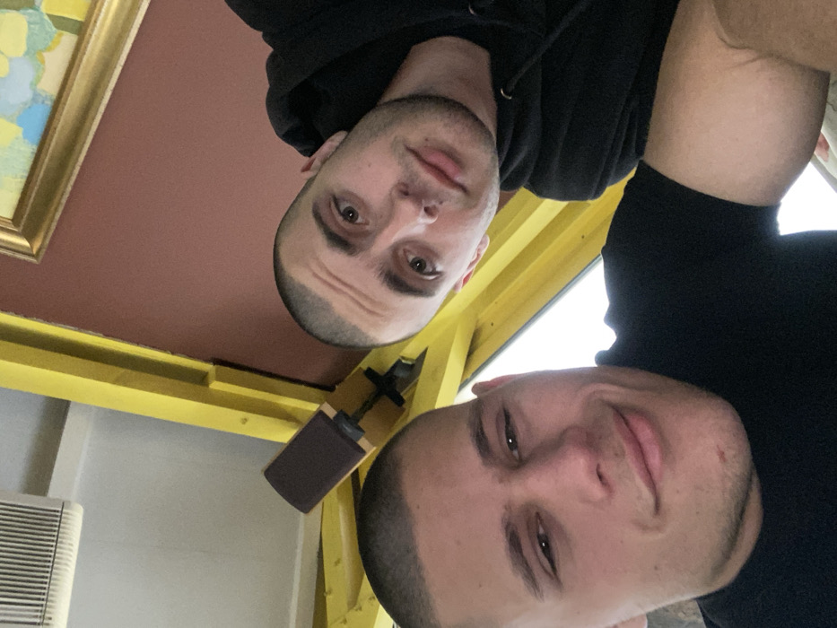 The image captures a selfie-style portrait of two adult males in an indoor setting located in Plovdiv, Bulgaria. Both individuals have closely shaven hair. The male on the left is positioned closer to the camera, wearing a black t-shirt and displaying a slight smile with partially closed eyes. The male on the right is situated further back, wearing a black hooded sweatshirt and maintaining a neutral expression while looking directly forward. The background prominently features a diagonal yellow beam or frame, with a white air vent visible against a light grey ceiling in the upper-left. A reddish-brown wall is visible in the upper-right, featuring a partially visible gold-framed painting with abstract blue, yellow, and green elements. A small, dark, rectangular object mounted on a short stand is visible between the two subjects, against the yellow beam. A bright, indistinct outdoor view is visible through what appears to be a window behind the male on the left.