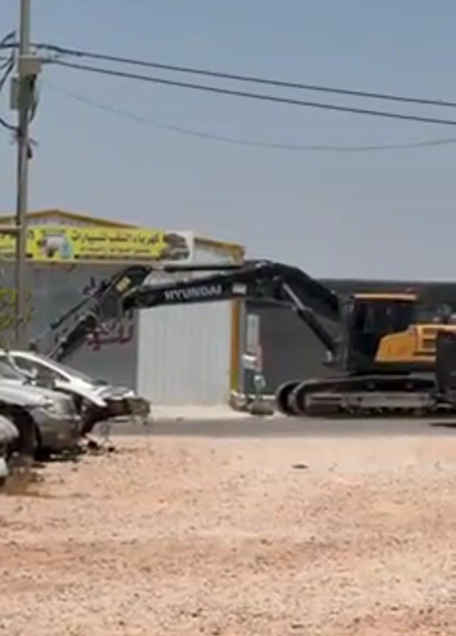Here's a concise description of the video: The video shows a Hyundai excavator at a junkyard. It's black and yellow, and is surrounded by crushed vehicles and gravel. The excavator is parked and its boom is raised. A building with Arabic writing is visible in the background. The video appears to be shot on a sunny day.