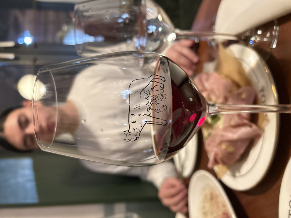The image depicts an indoor dining scene at TORO restaurant in Dnipro, Ukraine. In the foreground, a clear wine glass filled with dark red wine stands centrally. The glass is etched with a depiction of the Capitoline Wolf suckling Romulus and Remus. The stem of the glass is visible, resting on a dark wooden table. Behind the wine glass, a white ceramic plate with a gold rim is visible, displaying "TORO" in stylized lettering. On this plate rests a portion of sliced cured meat, possibly mortadella, arranged on pieces of bread or crackers. To the left, a second, partially visible white plate is present. To the right of the central wine glass, another clear, empty wine or water glass is visible. A person with dark hair, wearing a white long-sleeved shirt, is seated at the table in the background, out of focus. Their hands are visible on the tabletop. The background beyond the table is dimly lit, revealing a dark green wall to the left and blurred light sources to the right.