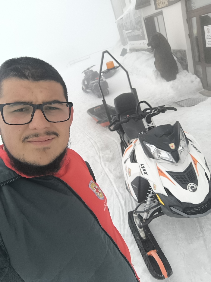 An outdoor winter scene captured in a selfie perspective in Panichishte, Bulgaria, depicts a male individual with multiple snowmobiles and a building