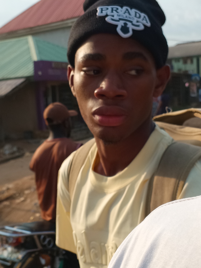 A young, dark-skinned man wearing a black Prada beanie is pictured outdoors. He's wearing a light yellow t-shirt and has a tan backpack on. A person in a brown shirt and cap is blurred in the background, standing near a motorcycle. Behind them, there's a glimpse of buildings with red and green roofs. The lighting is bright and sunny.