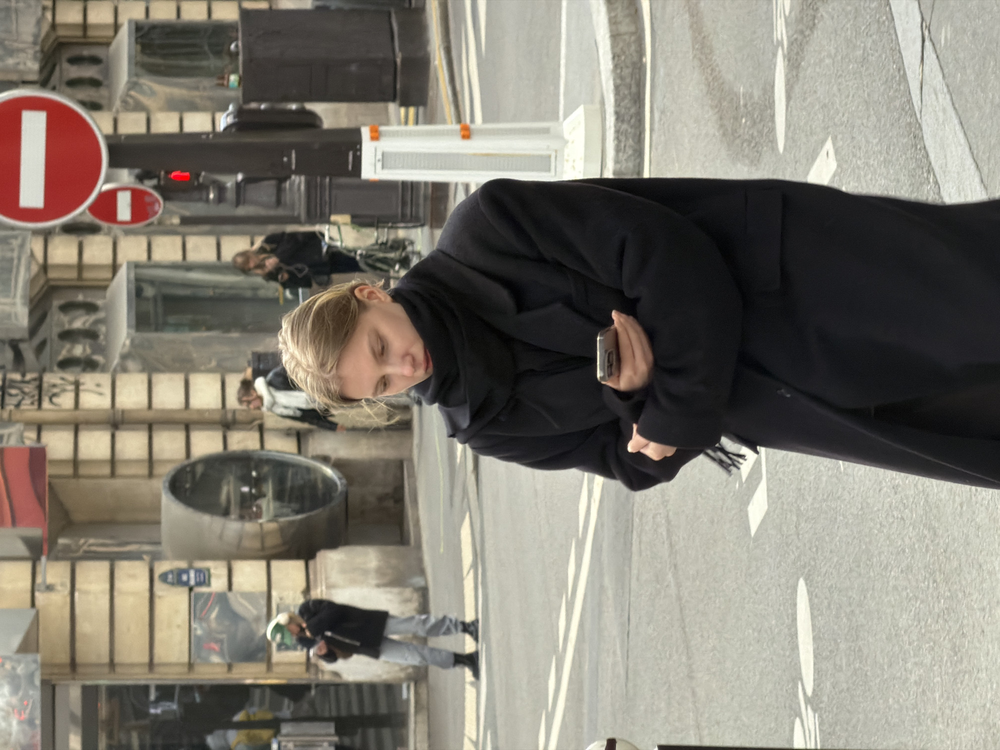 A woman is standing on a street in Paris, France. She is wearing a black coat and holding a cell phone. The street is paved with asphalt and has white lane markings. There are buildings on both sides of the street, including a bus stop and a shop. In the background, there is a crosswalk with other pedestrians using it. There are signs, street lamps, and street furniture visible.