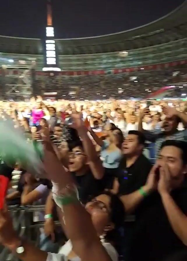 **Scene:** The video shows a dense crowd of people at a large outdoor stadium at night