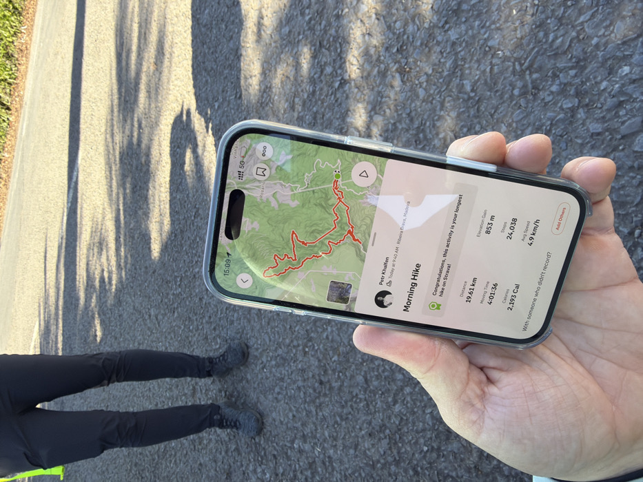 person holding an iPhone displaying the Strava app after completing a morning hike