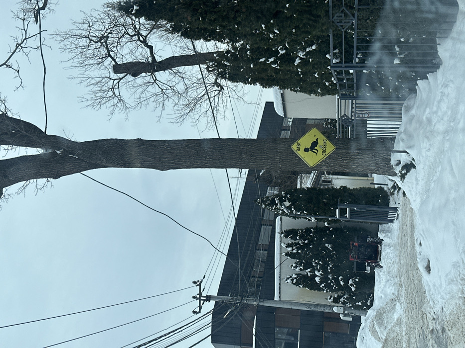 This image depicts a winter street scene in Irpin, Ukraine, under an overcast sky. The foreground and ground surfaces are covered in uneven snow. A prominent, thick-trunked deciduous tree stands centrally, featuring a yellow, diamond-shaped warning sign with a black border. The sign displays a black silhouette of a crawling baby and the text "BABY CROSSING" in black capital letters. To the right of the central tree, a dark-colored metal fence with decorative elements runs horizontally, partially obscured by snowdrifts and several snow-dusted evergreen conifer trees. To the left of the central tree, another segment of a dark metal fence is visible, alongside more snow-covered evergreen trees. Behind these evergreens, a small red and black piece of machinery, possibly a snow blower or mini-tractor, is partially visible. In the mid-ground, a utility pole with multiple cross-arms supporting numerous overhead electrical and communication wires rises on the left side. Behind the pole and trees, a modern, dark-colored building with large windows and a flat roofline is visible. Further deciduous trees, bare of leaves and partially covered in snow, extend into the background, beneath the gray sky. The scene shows no individuals.