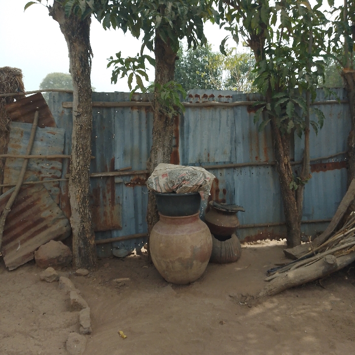 The image depicts an outdoor, unpaved area in Sabongari Garkida, Nigeria, under natural daylight. The ground is composed of bare, light brown earth, with a partial, low border of irregular stones in the left foreground. Three trees with rough bark and green foliage are visible; one on the left and two towards the center-right, positioned in front of a corrugated metal fence. In the central midground, a large, rounded, terracotta-colored earthenware pot rests directly on the ground. Stacked on top of this pot is a smaller, dark-colored basin, partially covered by a light-colored, patterned material, consistent with newspaper. To the right and slightly behind, a smaller, darker, traditional clay pot with a textured base is present. On the far left, behind the leftmost tree, a pile of dry vegetation, resembling hay or straw, is visible. Adjacent to this, leaning against the fence, are several pieces of corrugated metal sheeting, some significantly rusted, along with multiple wooden planks or poles. On the far right, a stack of cut wooden branches and logs lies on the ground. The background consists of a fence constructed from horizontal wooden poles overlaid with corrugated metal sheets, displaying varying degrees of rust and light blue-grey paint. A small section of green foliage from distant trees is visible above the fence line against a bright sky. No individuals or active subjects are present in the scene.