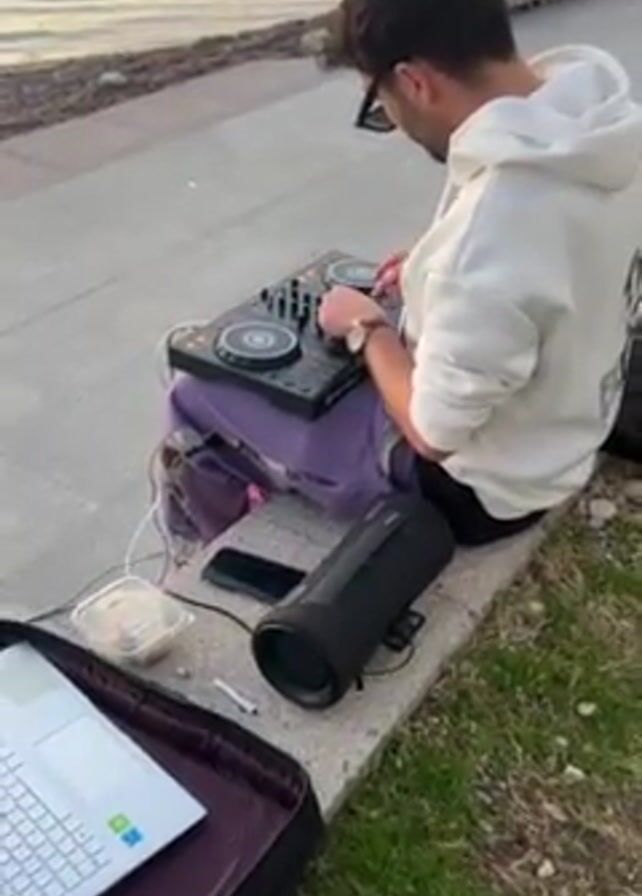A man is DJing at sunset next to the ocean