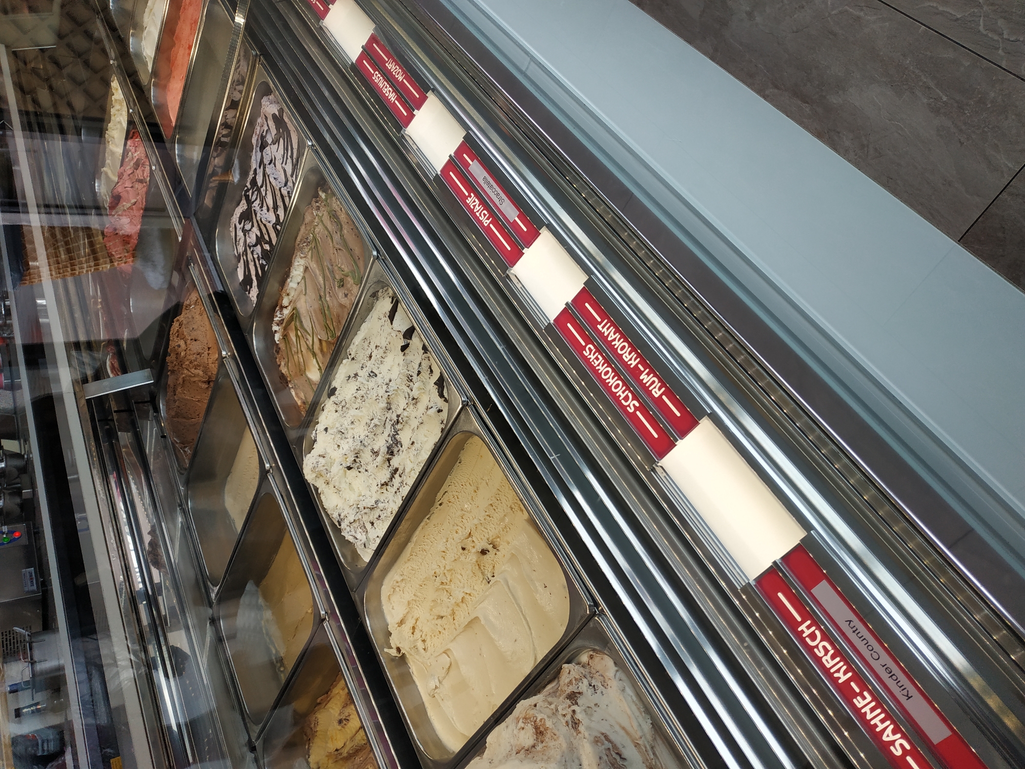 A slightly elevated eye-level, canted perspective captures a commercial freezer display case, laden with various flavors of ice cream. Metal containers hold the ice cream, and each flavor is identified by a label on a red strip along the upper edge of the case. These labels, written in German, include "SAHNE-KIRSCH", "Kinder Country", "SCHOKOKEKS", "RUM-KROKANT", "PISTAZIE", "Stracciatella", "HASELNUSS", and "MOZART". The background is of a contemporary aesthetic, with a light blue panel abutting a wall with large gray square tiles. The overall appearance is modern and clean, indicative of a commercial food establishment. This image was taken in the city of Lünen, Germany.