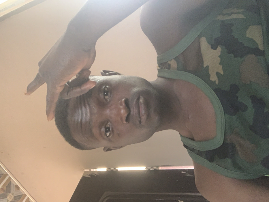 A dark-complexioned adult male is depicted in an indoor setting, posing in what appears to be Kado, Nigeria, though the specific location within the city is not visually discernible. The male, with short, dark hair and a fade haircut, looks directly into the camera with a neutral expression. His right hand is raised, fingers splayed, resting above his forehead. He is wearing a green camouflage-patterned tank top. The background features a plain, light-colored ceiling, with a decorative patterned tile section visible in the upper left corner. To the subject's left, a dark vertical door frame or wall edge is visible, illuminated by a bright vertical strip of light, suggesting an adjacent open space.