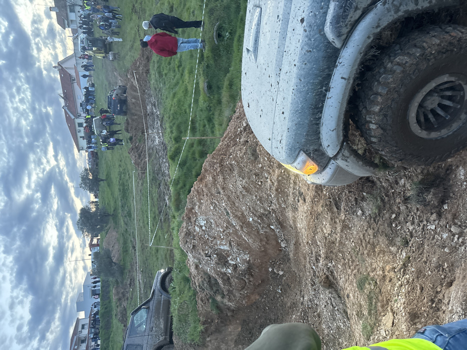An outdoor off-road event is depicted on a muddy, unpaved course at the edge of a residential area in Mirandela, Portugal, under an overcast sky. In the immediate foreground, the front passenger side of a mud-splattered grey off-road vehicle (SUV or truck) is visible, with its front right wheel featuring aggressive tire tread. The vehicle's amber turn signal is illuminated. To the left of this vehicle, a large pile of excavated earth and rocks forms an obstacle or bank. The lower left corner shows a partial view of a person wearing a neon yellow/green safety vest and blue jeans, standing on the dirt track. The midground features a series of muddy tracks, earth mounds, and depressions, demarcated by white tape strung between thin poles. On the left side, another dark-colored, mud-covered off-road vehicle is ascending a dirt incline. Further towards the center-right, a second dark off-road vehicle is navigating a muddy pit or trench. To the right of the track, two male spectators are observed standing on a grassy rise; one wears a red hoodie and blue jeans, the other a dark jacket and dark trousers. In the background, a large number of spectators are gathered on elevated grassy slopes, observing the event. Behind these slopes, several light-colored residential buildings with tiled roofs are visible, indicating the proximity of a populated area. Scattered trees are present on the slopes. On the far right, a yellow construction excavator is visible.