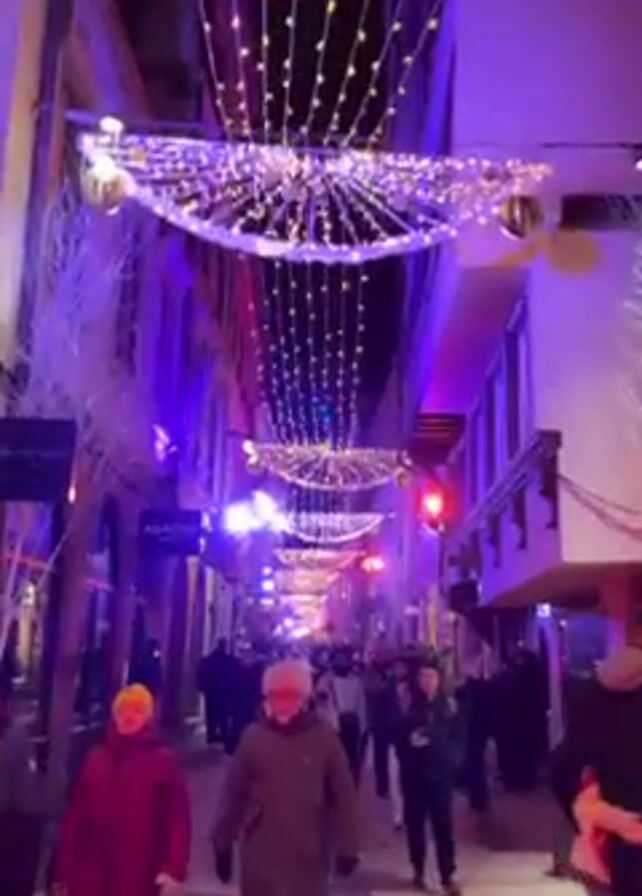 A street decorated with Christmas lights at night, with many people walking. The street is illuminated with blue and purple lights. A man walks toward the camera wearing a yellow hat and a red jacket. Other people are walking towards the camera. The street is narrow, lined with buildings. Some of the buildings have lights shining on them. There are strings of lights hanging above the street in an umbrella shape.