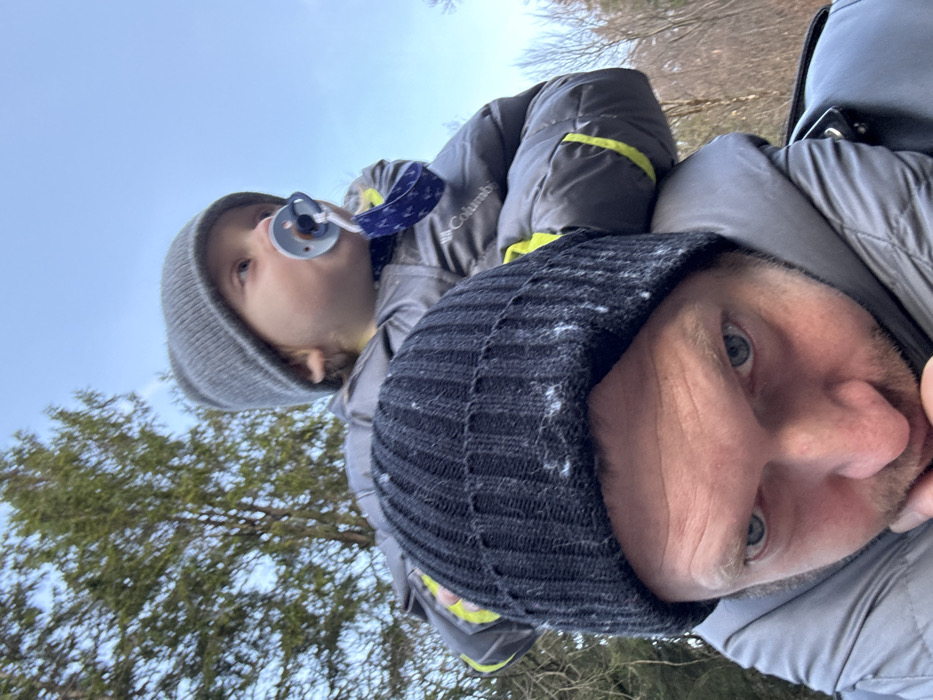 This image, taken in Bellagio, Italy, displays an adult male carrying a young child on his shoulders in an outdoor setting. The man, visible from the eyes upward, wears a black ribbed knit beanie adorned with white particulates and a grey puffer jacket. He possesses light-colored eyes and facial stubble, with his gaze directed forward or slightly downward. Perched on the man's shoulders, the child wears a light grey ribbed knit beanie and a grey puffer jacket featuring yellow-green accents. A light blue pacifier, attached to a blue and white patterned fabric strap, is present in the child's mouth. The child's light-colored eyes are directed towards the upper right portion of the frame. The background reveals a clear light blue sky above evergreen and bare deciduous trees, indicating a natural, possibly wooded environment during a cool period.