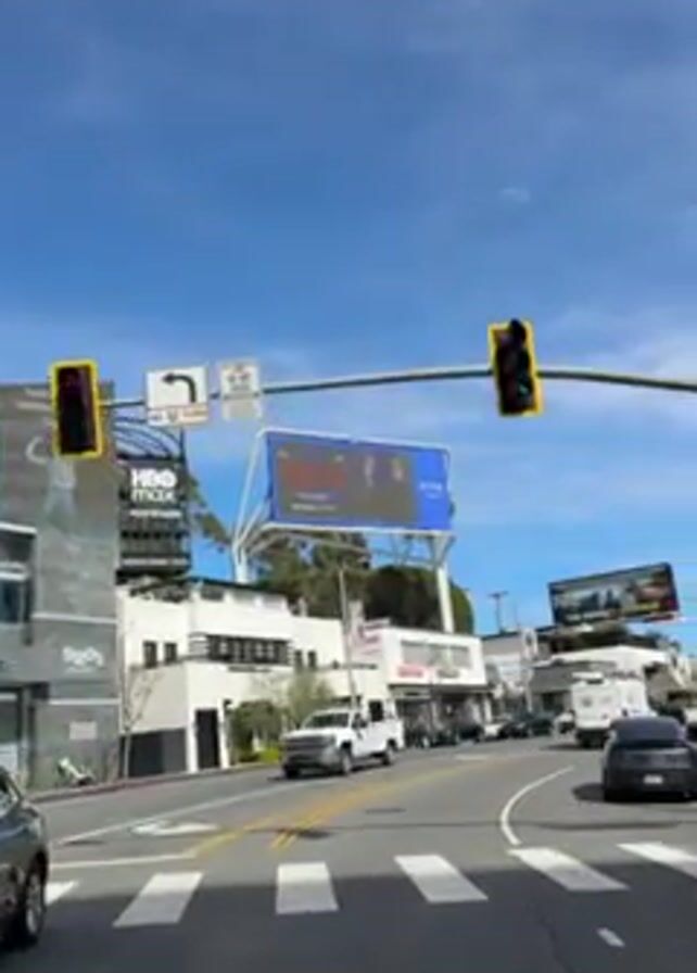 street scene in what appears to be a city, based on the volume of traffic and the presence of large billboards. The sky is blue with some wispy clouds. The street has a pedestrian crosswalk and there are cars, pickup trucks, and a white van driving on the road. Several large billboards are visible on either side of the street, advertising various products and television shows. One billboard features an advertisement for an Amazon Prime show. There are also traffic lights overhead, with one set displaying a yellow light. Buildings line the street. The overall impression is that of a busy urban area on a sunny day.