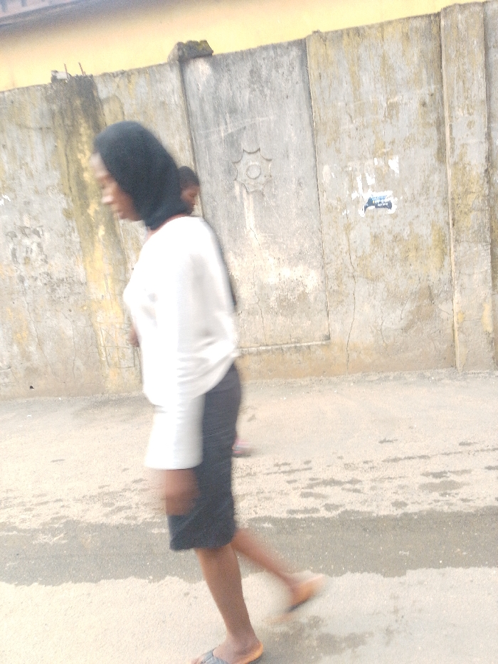 A blurry image captures a person walking past a weathered concrete wall. The individual wears a dark head covering, a white top, and a dark skirt or shorts, with sandals on their feet. Their movement is evident in the blurred effect. A second, smaller figure is partially visible behind the first person. The wall shows signs of age with cracks, stains, and a faded decorative element. A small, torn piece of paper adheres to its surface. The ground is a paved area with damp patches.