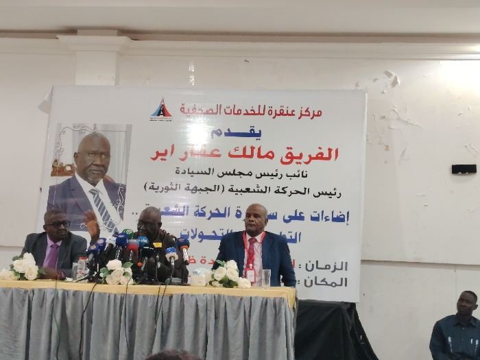 The image depicts an indoor press conference or public address in the city of Unknown, Unknown. In the background, a large white banner displays Arabic text, including "Anqara Center for Press Services," and "General Malik Agar Ayar," identified as "Deputy Chairman of the Sovereign Council" and "Chairman of the SPLM-N (Revolutionary Front)," alongside his portrait. The wall above and to the right of the banner shows areas of peeling white paint. A black rectangular object is mounted on the wall to the far right. In the foreground, a table covered with a pleated grey fabric is set with white floral arrangements on either side of the speakers. Three adult Black males are positioned behind the table. From left to right: a man wearing a purple shirt, dark suit jacket, and glasses sits looking towards the center; a man wearing a dark olive uniform-like jacket and glasses sits centrally, gesturing with his raised right hand, positioned behind a cluster of approximately 8-10 microphones with various media flags; and a man in a blue suit jacket, white shirt, and a red lanyard with an ID badge stands, addressing the audience. A glass of water and white tissue boxes are present on the table. To the far right, a fourth adult Black male in a dark shirt is partially visible, standing and observing the event.