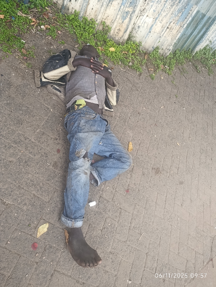 A person lies on a concrete surface near a wall with green vegetation. They wear worn jeans with a hole in the knee, a gray shirt, and a jacket. Their feet are bare. The person is positioned in the center of the frame, with their head near the wall and feet extending towards the lower right corner. A white object is near their leg. The date 06/11/2025 09:57 is imprinted on the lower right corner.
