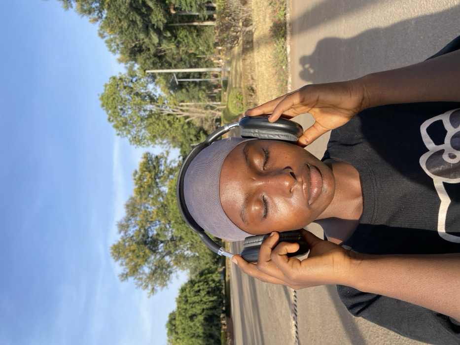 The image displays a young female individual positioned centrally outdoors in Vom, Nigeria. Her eyes are closed, and her head is slightly tilted forward. She wears a dark grey head covering, under which black over-ear headphones with metallic accents are placed. Her hands are raised, gripping the earcups of the headphones. She is dressed in a black short-sleeved t-shirt featuring a partially visible light-colored graphic design on the chest. Strong natural sunlight illuminates the scene from the upper left, casting distinct shadows on the light-colored paved ground. The background consists of a clear blue sky above a verdant landscape with numerous green trees, some showing lighter green or yellowish foliage, and manicured grassy areas. A light pole is visible in the middle-right section of the background among the trees.