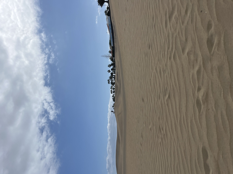 sandy, undulating desert landscape with a blue sky and white clouds above