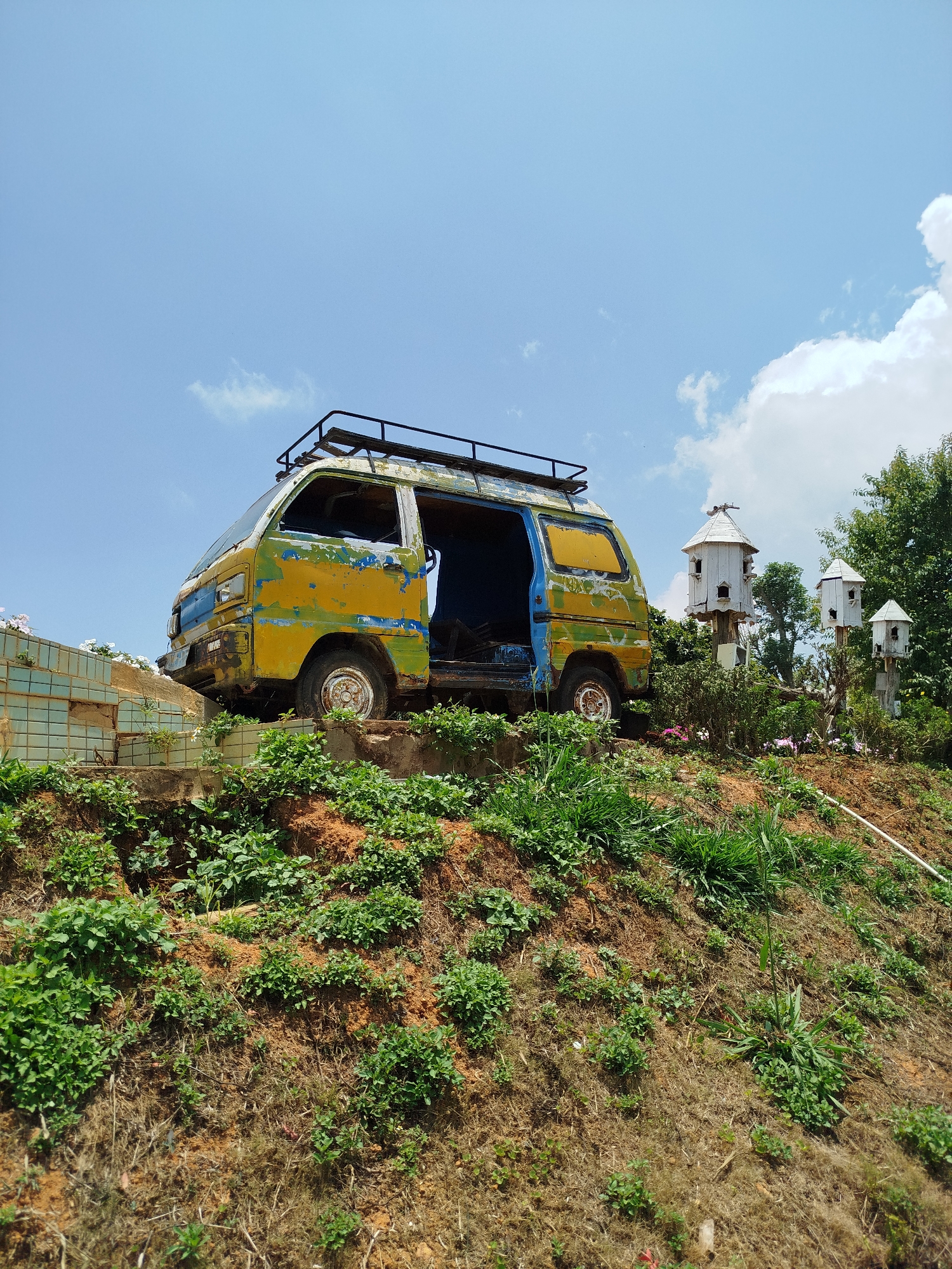 n old, yellow and blue van with a roof rack parked on a tiered, earthen hillside with green vegetation. The van's door is open, revealing the interior. To the right of the van, there are three white, multi-tiered birdhouses on posts, surrounded by plants and a white pipe. The hillside is layered, with some sections constructed of tiled walls. The soil appears reddish-brown. The sky is blue with scattered white clouds. The location is Phát Chi, Vietnam.