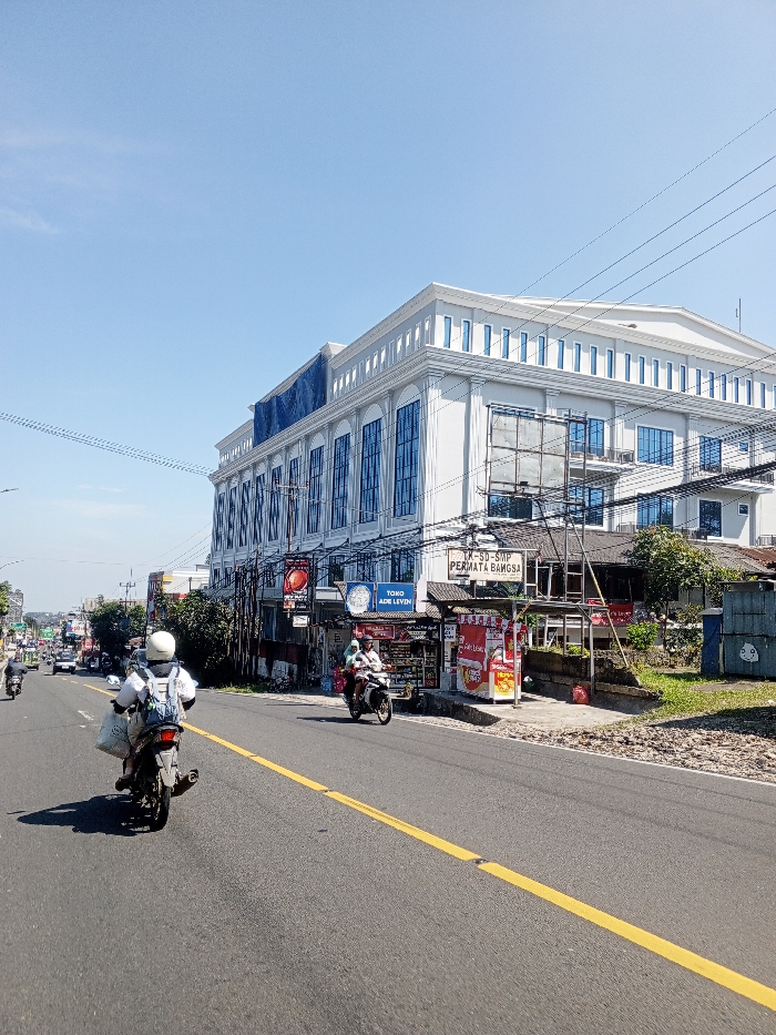 The image displays an urban street scene on a clear, sunny day. The foreground features an asphalt road with a continuous yellow center line. A person wearing a white helmet and white backpack rides a dark motorcycle, moving away from the viewer in the left lane; a white package is secured to the back of the motorcycle. Further right, two individuals ride a lighter-colored motorcycle, also moving away from the viewer. In the background, other vehicles are visible on the road. On the right side of the road, a large, multi-story building with a white or light-colored facade dominates the mid-ground. The building features multiple tall, blue-tinted windows arranged vertically, and decorative architectural elements along its roofline. A section of the upper left facade is partially obscured by a blue tarp. Below this main structure, at street level, are smaller commercial establishments with varied construction, including a structure with a corrugated metal roof. Visible signage includes "TK-SD-SMP PERMATA BANGSA" and "TOKO ADE LEVIN," indicating educational and retail facilities. An empty metal billboard frame stands prominently in front of these lower structures. Numerous utility poles and a dense entanglement of overhead power and communication lines are present throughout the mid-ground and foreground. Green foliage is visible along the roadside and behind some of the smaller structures. The language on the signs, specifically "PERMATA BANGSA" and "TOKO," indicates the location is in Indonesia.