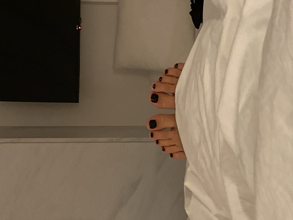 The image depicts a close-up, horizontal view of a person's feet resting in a bed within an indoor setting in Skala, Greece. The feet are positioned in the mid-ground, extending from beneath rumpled white bed sheets that cover the lower portion of the frame. Both feet have all ten visible toenails painted with a dark, likely black, polish. In the background, to the left, a light-colored, vertical panel or cabinet door is visible. To the right, a dark, rectangular, wall-mounted television screen is powered off but displays a small red standby indicator light in its lower right corner. Below the television, a section of a white pillow is visible, with a dark, indistinct object, possibly an item of clothing, resting to its right. The overall lighting is dim, suggesting an evening or low-light environment. No other individuals or significant actions are depicted.