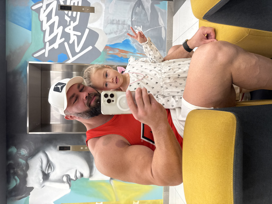 An adult male and a young female child are seated in a modern interior, identified as a public space within Dubai, United Arab Emirates. The male, positioned on the left, has a shaved head, a full beard, and a muscular physique, evident in his arms and legs. He wears a white mesh baseball cap with a black Jordan logo, a red tank top, and white shorts. A dark, circular mark is visible on his left deltoid. He holds a light-colored smartphone, appearing to be an iPhone 15 Pro Max with a visible MagSafe ring on its back, in his right hand, angled as if taking a selfie. A black watch is worn on his left wrist. The female child, positioned to the right of the male and slightly forward, appears to be between four and six years old. She has light-colored hair, partially secured with a pink bow on her right side, and wears a long-sleeved white dress patterned with small black hearts, along with a thin pink necklace. Her left hand is raised, forming a peace sign (V-sign). Both individuals are looking directly at the camera. They are seated on chairs featuring mustard yellow top cushions and dark grey bases, partially visible in the foreground. The background consists of a light-colored floor and walls adorned with contemporary murals. To the left, a large grayscale depiction of a classical male bust, resembling Michelangelo's David, is painted against an abstract background of teal, light blue, and yellow geometric shapes. To the right, abstract graffiti-style artwork in grey, white, and blue covers the wall. Centrally, a modern, brushed metallic elevator door with a vertical control panel is visible.