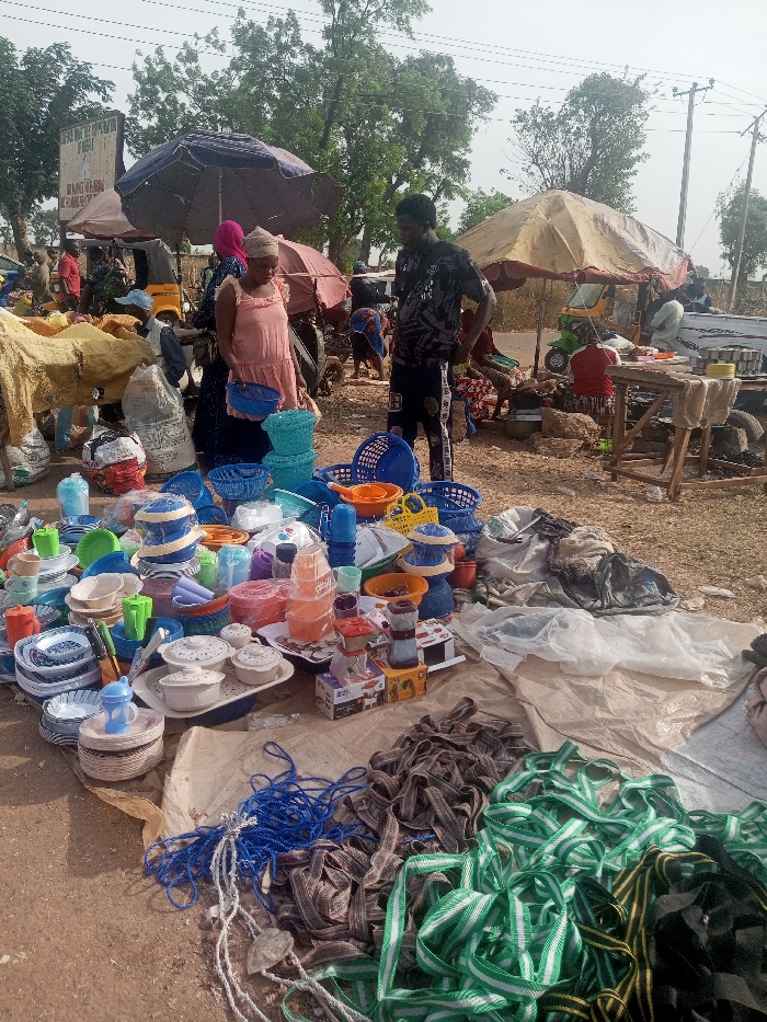An outdoor market scene in Kakuri Gwari, Nigeria, is depicted under bright daylight on what appears to be dirt ground
