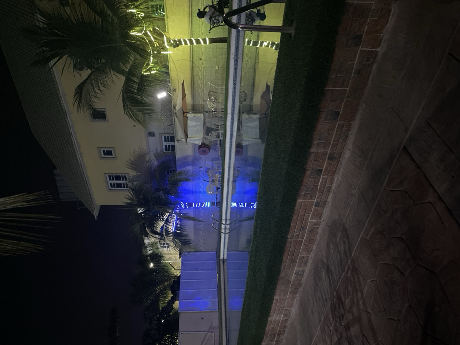 A building with a yellow facade and several windows stands illuminated, flanked by palm trees. A pool reflecting blue light sits adjacent, bordered by a manicured green strip and a textured brown wall. Outdoor seating is visible near the building, possibly under umbrellas. The scene appears to be captured at night or dusk.