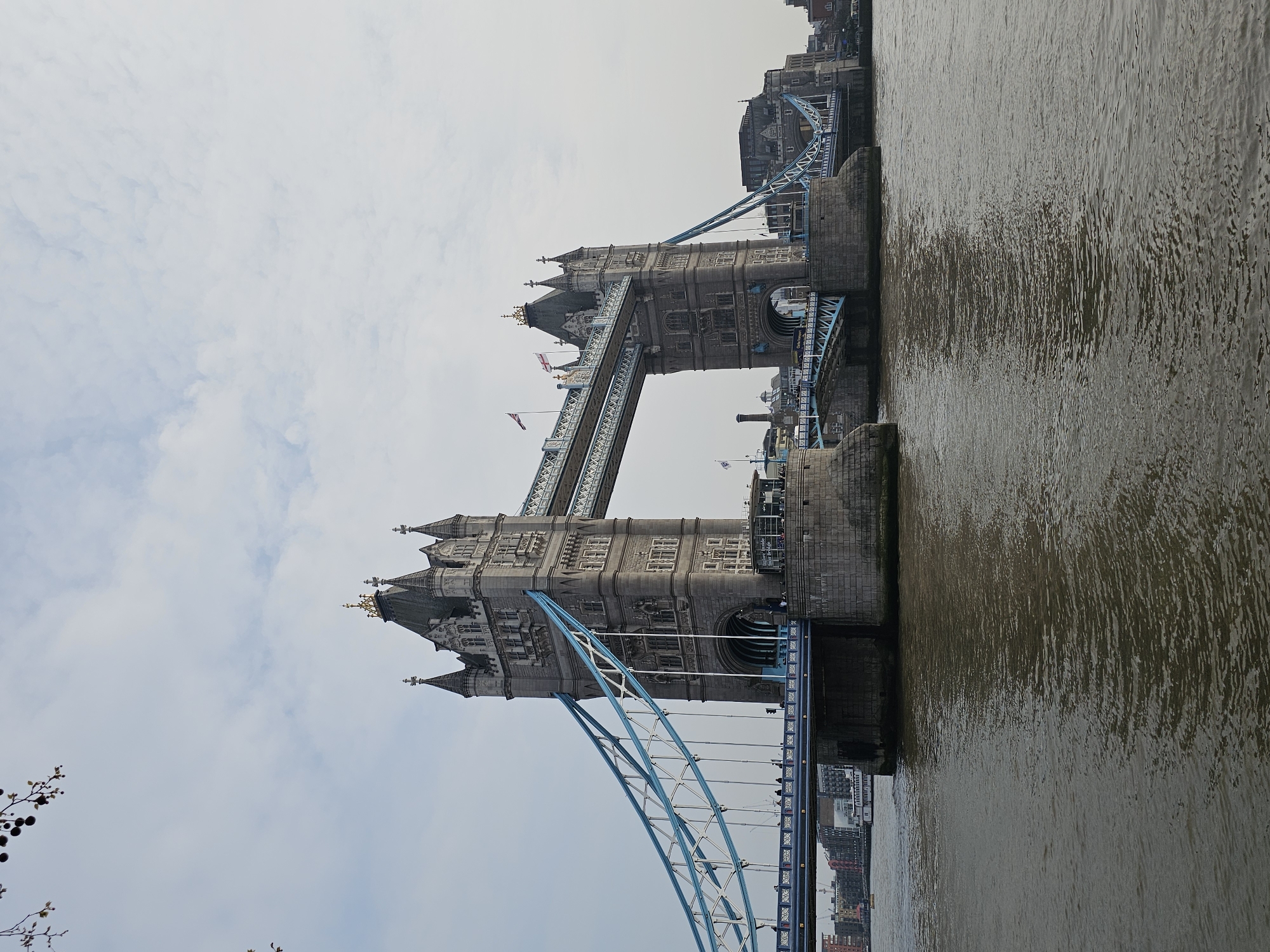 The scene depicts Tower Bridge in London, United Kingdom, under a light grey, cloudy sky. The prominent subject is the Neo-Gothic bascule and suspension bridge, featuring two substantial grey stone towers with intricate architectural detailing, multiple turrets, and gold finials atop their peaks. Blue suspension cables are visible, supporting the bridge structure. Union Jack flags fly from both towers. The lower deck of the bridge is populated by numerous small figures, identified as pedestrians, indicating foot traffic. The surface of the River Thames, characterized by its brownish, rippled appearance, flows beneath the bridge and occupies the foreground and mid-ground. Distant urban buildings line both riverbanks. A white riverboat is partially visible on the left side of the river. Minimal tree foliage, including bare branches with small dark spherical objects (likely sycamore fruits), is present in the upper left corner.