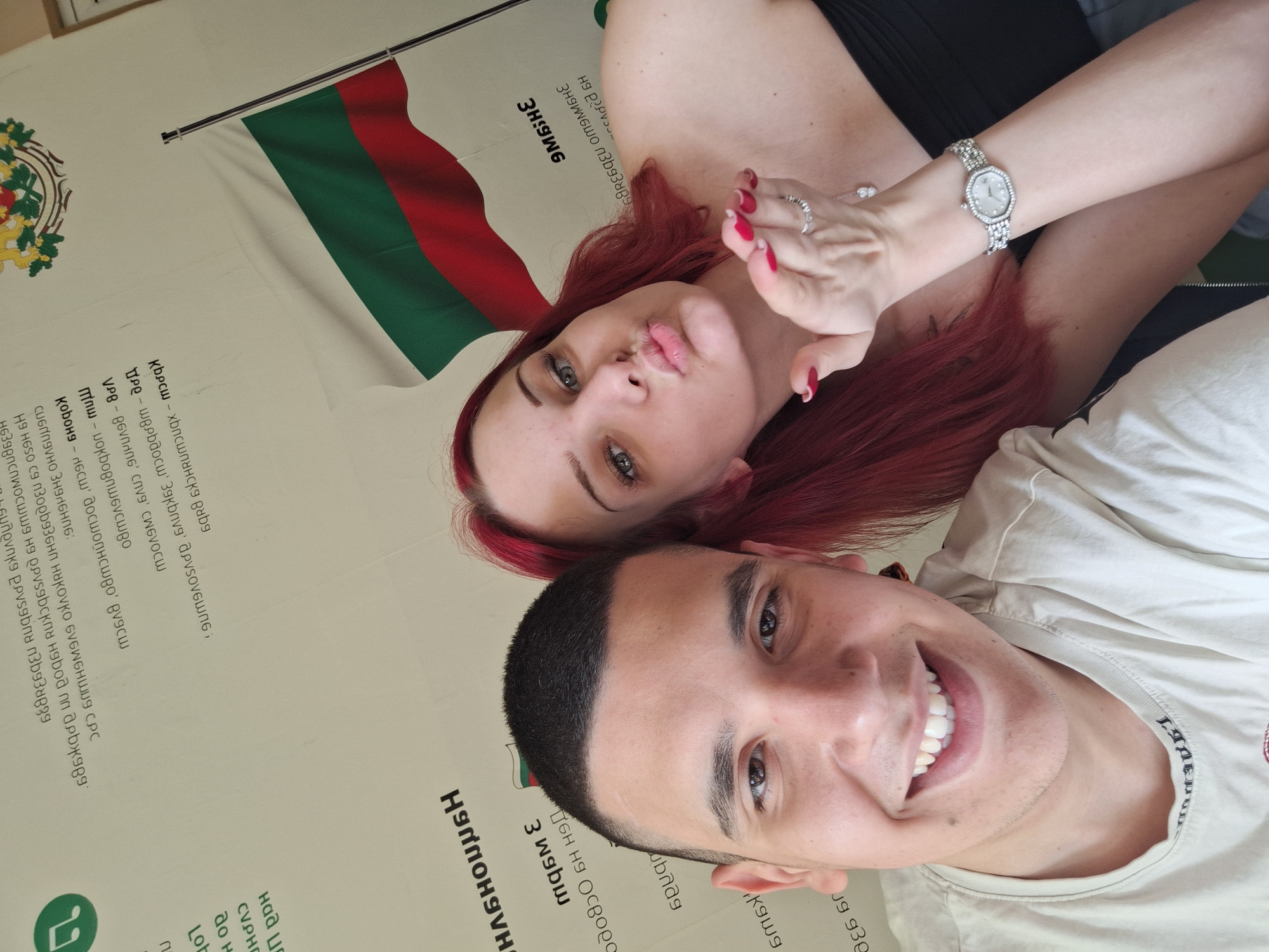An indoor, close-up selfie captures two young adults against a light-colored wall or banner. The background is printed with mirrored Cyrillic text, including "КОЗЛОДУЙ" (Kozloduy) and "БЪЛГАРИЯ" (Bulgaria), along with phrases such as "ДЕН НА ОСВОБОЖДЕНИЕТО" (Day of Liberation). A prominently displayed Bulgarian flag (white, green, red horizontal stripes on a pole) and the Coat of Arms of Bulgaria are also visible, confirming the location is within Kozloduy, Bulgaria. In the foreground, a light-skinned male with a dark buzz cut, dark eyes, and slight stubble smiles broadly at the camera. He wears a light-colored crew-neck t-shirt. To his right and slightly behind him, a light-skinned female with long, bright red hair and light-colored eyes poses with her lips pursed in a "kiss" gesture. Her right hand is extended towards the camera, fingers slightly curled, revealing red-painted fingernails. She wears a black strapless top, multiple silver-colored rings on her fingers, a silver-colored watch with an embellished face on her left wrist, and a delicate silver-colored necklace.