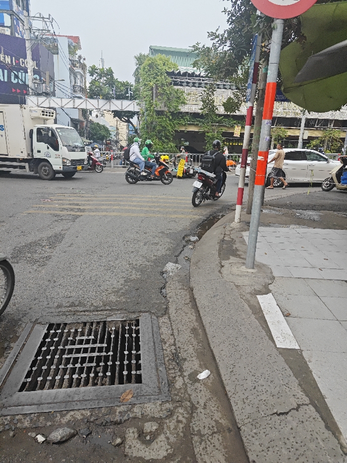 The image depicts a street scene at an intersection in Ho Chi Minh City, Vietnam, under an overcast sky. In the immediate foreground, a square, metal storm drain cover with a patterned grate is embedded in the asphalt road surface on the left. Adjacent to it on the right is a concrete curb separating the road from a tiled sidewalk. A thin white line is painted on the side of the curb, and a small piece of white litter is visible near its base. Three striped utility poles (red, white, and grey segments) stand on the right side, with a partial red "do not enter" traffic sign visible at the top right, attached to one pole. The mid-ground features an asphalt road with faded yellow horizontal stripes, likely a pedestrian crossing. Multiple vehicles and individuals are present. A white box truck is partially visible on the far left, moving towards the viewer's left. Central to the image are two motorcycles; one dark-colored motorcycle carries two riders wearing green helmets and shirts (consistent with a Grab ride-sharing service), with the passenger in a green shirt and the driver in a white shirt. Behind them, an orange and black motorcycle is also present. A dark-colored motorcycle with a single rider wearing a black helmet and backpack is positioned in the right mid-ground, facing left. Further right, a male pedestrian in a light tan shirt and shorts is walking across the road, positioned near a white sedan. Another light blue scooter is partially visible on the far right edge of the road. The background reveals a dense urban environment. Multi-story buildings line the street. One prominent building on the right-center is extensively covered in green vines and foliage. On the far left, a building features a large blue billboard with white text. A white metal pedestrian overpass spans the width of the road in the distance, connecting buildings on either side. Scattered trees and general urban vegetation are visible above and behind the structures.