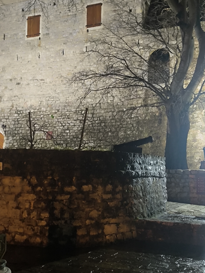 A nighttime view showcases a stone fortification topped with a cannon. The stone structure is illuminated with a warm light, contrasting with the darker water in the foreground. A tree with bare branches dominates the right side of the frame, partially obscuring a building with shuttered windows above. The stone wall behind the cannon is detailed with textures and variations in color.