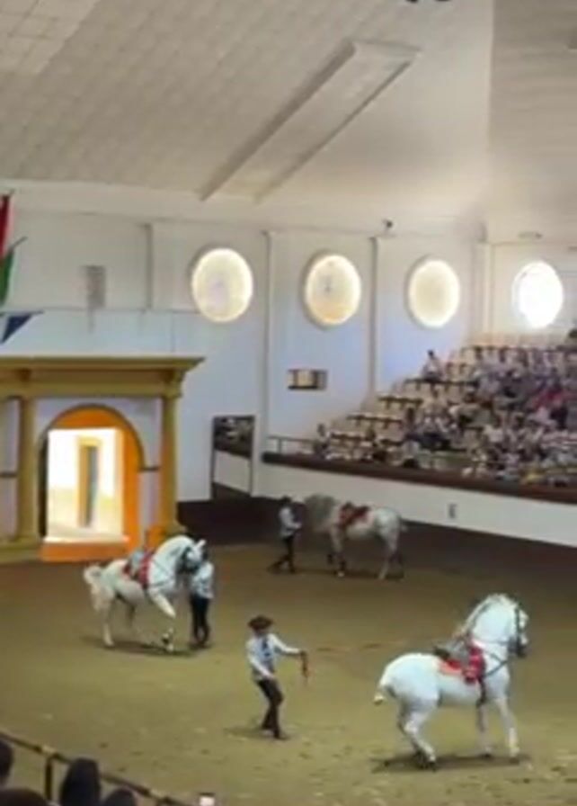 performance with horses indoors. Several white horses are in the arena with two handlers dressed in traditional clothing. The horses are wearing decorative saddles and are performing. A crowd of people is sitting on risers watching the performance. People in the foreground are taking pictures or videos with their phones. The arena is large and well-lit with decorative arches and flags. The walls are white and the ceiling is high and paneled.
