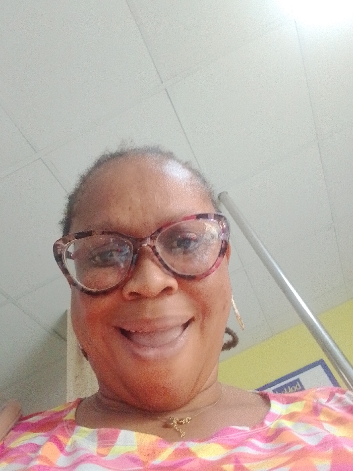 The image captures a close-up, low-angle selfie of an adult female, estimated to be between 40 and 60 years old, with light brown skin and dark, short hair. She wears large, cat-eye style eyeglasses with mottled red and brown frames. Her mouth is open in a wide smile, revealing her teeth. A thin, gold-colored necklace with a small pendant is visible around her neck. She is dressed in a multi-colored garment featuring a pattern of orange, pink, and white shapes. The background consists of a white ceiling with visible grid panels. To the upper right, a vertical silver-colored metallic pole is present. Below the pole, a section of a yellow wall is visible, on which a partially obscured blue and white sign displaying some text, including "d" and "Dod," is mounted. The specific location within the city of Agani, Nigeria, is not discernible from the provided visual information.