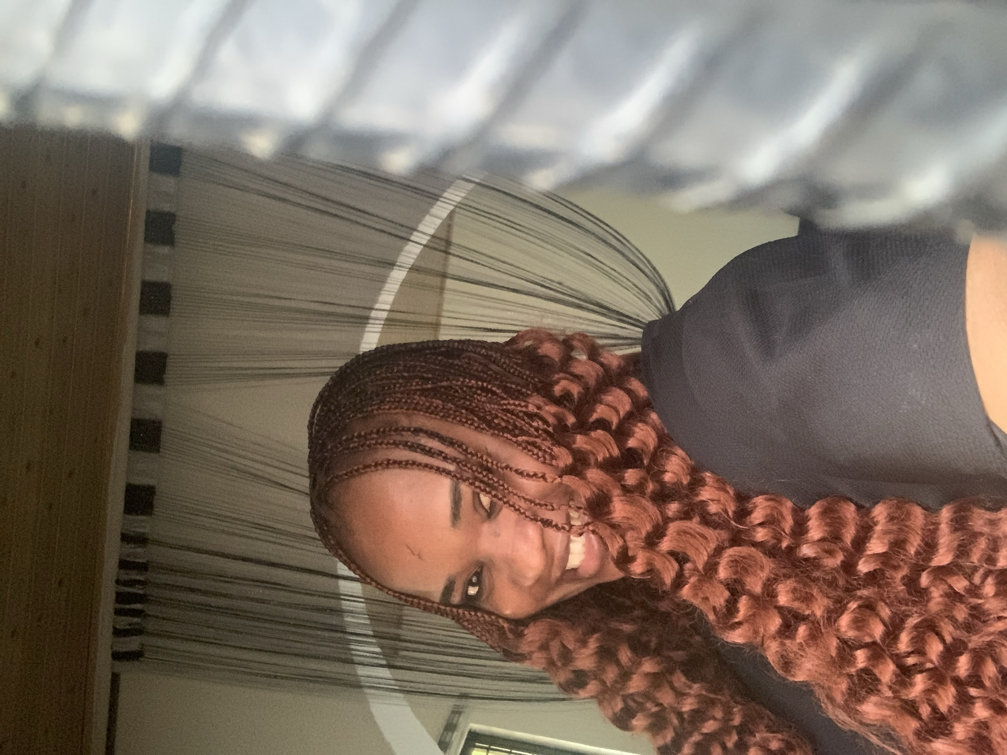 A medium shot depicts a smiling woman with brown, curly braided hair and a dark shirt