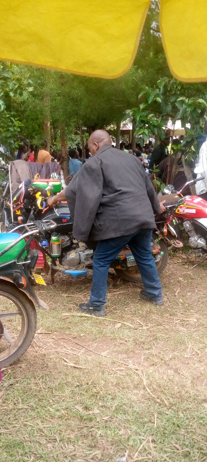A man in a black jacket and blue jeans is standing next to a black motorcycle with green and red accents. He is holding the handlebars with his right hand and his left hand is visible. The motorcycle is parked on a grassy patch of land with dry grass and twigs scattered around. The man is looking towards the camera, but the face is not clear. There are other people in the background, sitting and standing near a yellow tent-like awning. They are not clearly visible. This scene appears to be taken near a community gathering in Burundu, Kenya. The man is interacting with the motorcycle. The image was taken under a partially cloudy sky.