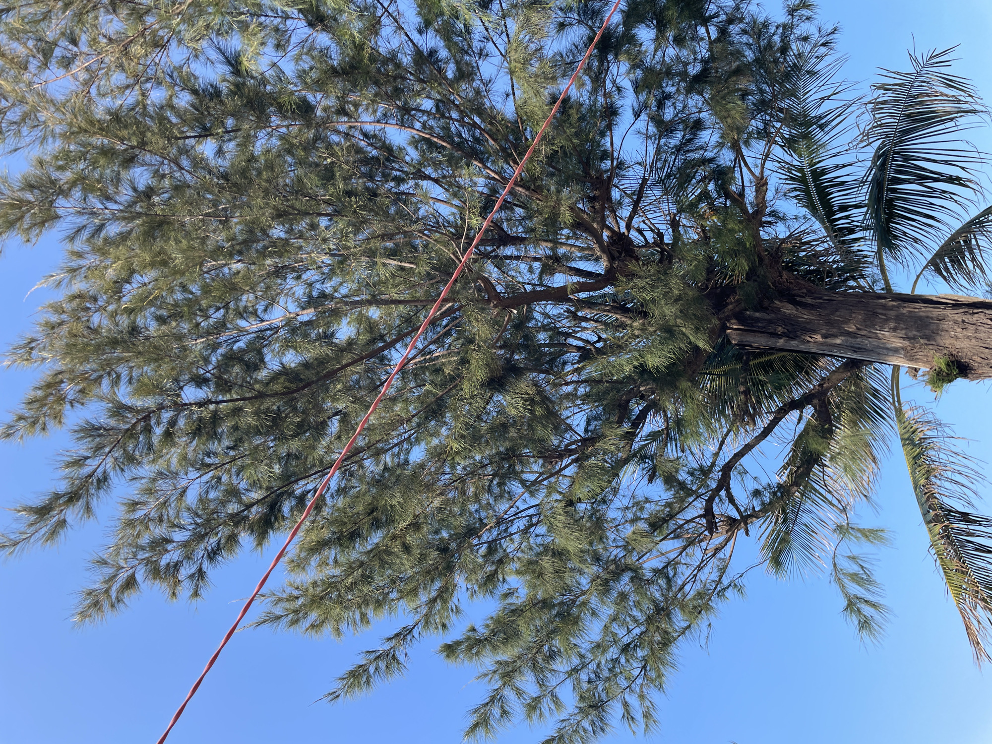 view looking up into the canopy of a tree, likely a Casuarina, with a section of a palm tree visible on the right side