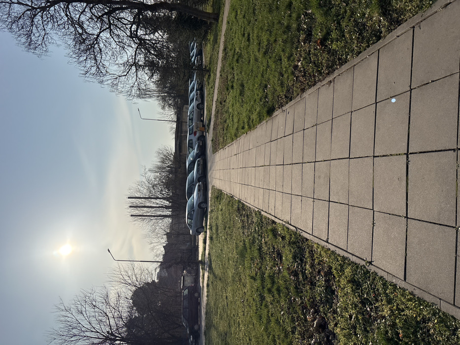 The image depicts an outdoor urban scene in Targovishte, Bulgaria, under bright daylight, with the sun creating a strong glare in the upper left portion of the sky. A straight paved pedestrian path, composed of square concrete tiles, extends from the foreground to the mid-distance. Green grass with scattered dry leaves and patches of brown vegetation borders both sides of the path. A small, white circular object is visible on one of the concrete tiles in the lower right section of the path. In the midground, a line of approximately ten parked vehicles, primarily sedans and hatchbacks of various colors (including silver, dark blue, and white), occupies a parking area situated beyond the path's terminus and extending from the left towards the right. Bare deciduous trees with visible branches and two streetlights are positioned along the edges of the parking area and the path. The background features indistinct buildings and two prominent dark, vertical industrial chimneys or stacks, visible on the left side against a light blue sky with minimal cloud cover. No people are visible, and no active interactions are depicted.