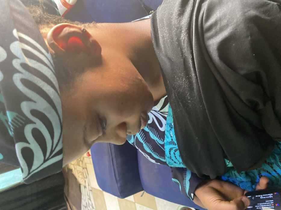 - "An individual with dark skin, wearing a black and light blue patterned headwrap and a corresponding garment partially obscured by a plain black overlay, is seated indoors, focused on a smartphone held in their left hand" by FM-BnY1n1, licensed under CC BY 4.0
