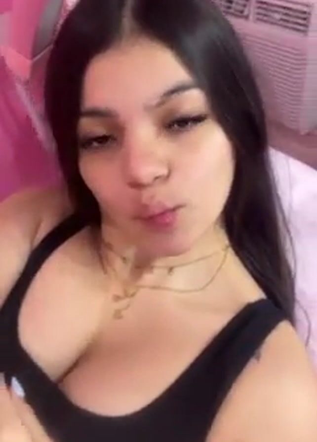 young woman with dark hair wearing a black tank top. She is facing the camera with a slight smile. She is wearing a gold necklace and has long eyelashes. Behind her, a pink wall and a small shelf with various items can be seen. An air conditioning unit is visible in the background. She seems to be recording a selfie video.
