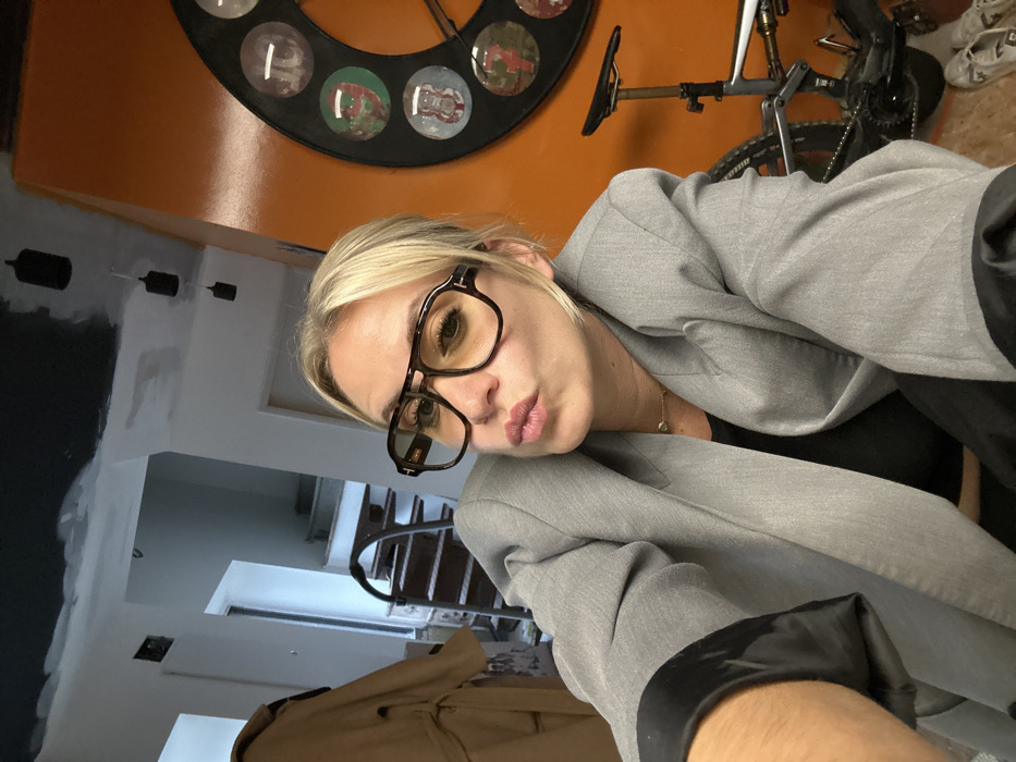 This image depicts a female individual located indoors in Saint-Médard-en-Forez, France. The subject, with blonde hair, is positioned in the foreground, looking directly at the camera with a pouting expression. She wears large, dark-framed glasses with amber-tinted lenses, a light grey oversized blazer with black lining visible at the cuffs, and a black top, accessorized with a thin gold necklace. The background reveals a multi-faceted interior. To the left of the subject, a tan-colored coat hangs, partially obscuring a dark, industrial-style hand truck. Beyond these objects, a light-colored staircase with a dark handrail ascends into a doorway. The ceiling above is partially painted in dark and light tones, suggesting an unfinished or industrial aesthetic, and three black cylindrical pendant lights are suspended in a row. To the right of the subject, a vibrant orange wall serves as a backdrop for a large, black circular decorative object, which contains twelve smaller, distinct circular inserts with various colored designs. Below this, portions of a bicycle, including its seat, frame, and gears, are visible. Two pairs of light-colored shoes are visible on the floor in the bottom right corner.