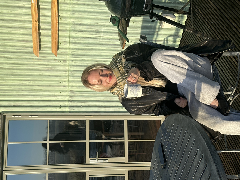 A blonde female is seated outdoors on a dark slatted metal chair, facing slightly left, located in East Suffolk, United Kingdom. She wears a light-colored plaid scarf, a dark jacket, a dark top, and grey sweatpants. Her eyes are closed, and she displays a slight smile while holding a white mug with blue detailing in her right hand. A silver-colored ring is visible on her right ring finger. To her left, a round, dark grey slatted metal table holds a dark smartphone. Behind her to the left are light-framed glass double doors reflecting a clear sky, distant landscape, and the silhouette of an individual holding a phone. To her right is a light green corrugated metal wall featuring two horizontal wooden planks. A dark green Big Green Egg-style barbecue grill on a stand with a wooden side shelf is positioned to the right of the woman. The scene is brightly lit by direct sunlight, casting shadows across the dark slatted deck flooring.