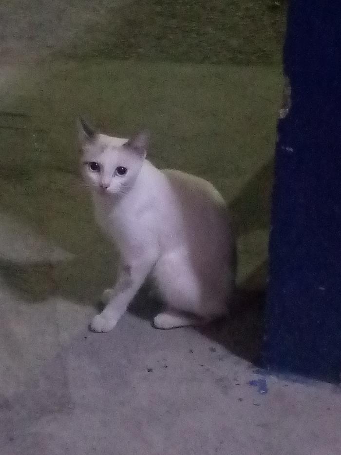 A white cat with light gray patches sits on a concrete surface. The cat gazes towards the viewer with slightly tilted head. The background is a blurred mix of green and gray. A dark blue or black object, possibly a post or doorframe, is visible on the right edge of the image. The lighting is dim, creating shadows around the cat.